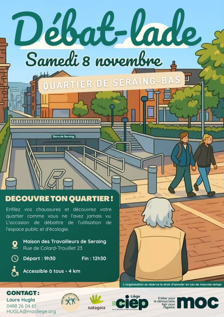 Le CIEP de Liège vous invite à une expérience originale et conviviale le samedi 8 novembre à Seraing-Bas : une Débat-lade pour explorer, discuter et redécouvrir votre quartier autrement. Au programme : une balade de 4 km ponctuée d’échanges autour de deux grands thèmes qui nous concernent tous: l’utilisation de l’espace public et l’écologie urbaine.