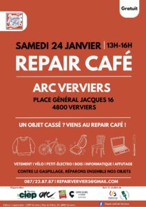 Le premier Repair Café verviétois de 2026 aura lieu le samedi 24 janvier (13h-16h) dans les locaux de l’ARC (Place Général Jacques 16, 4800 Verviers) 🔧